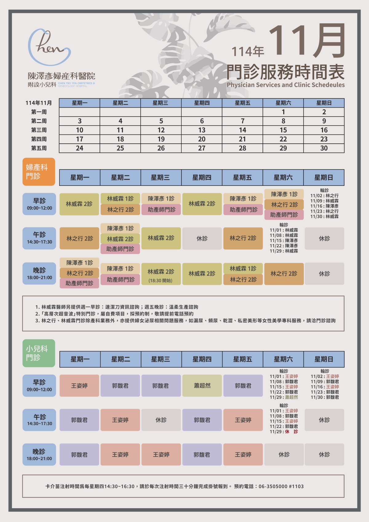 公告:114年11月份門診時間表