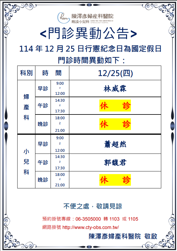114年12月25日 行憲紀念日婦產科門診時間異動公告