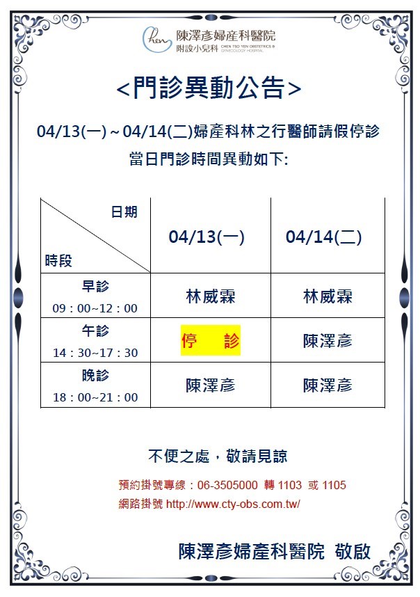 115年04月13~14日 婦產科門診異動公告