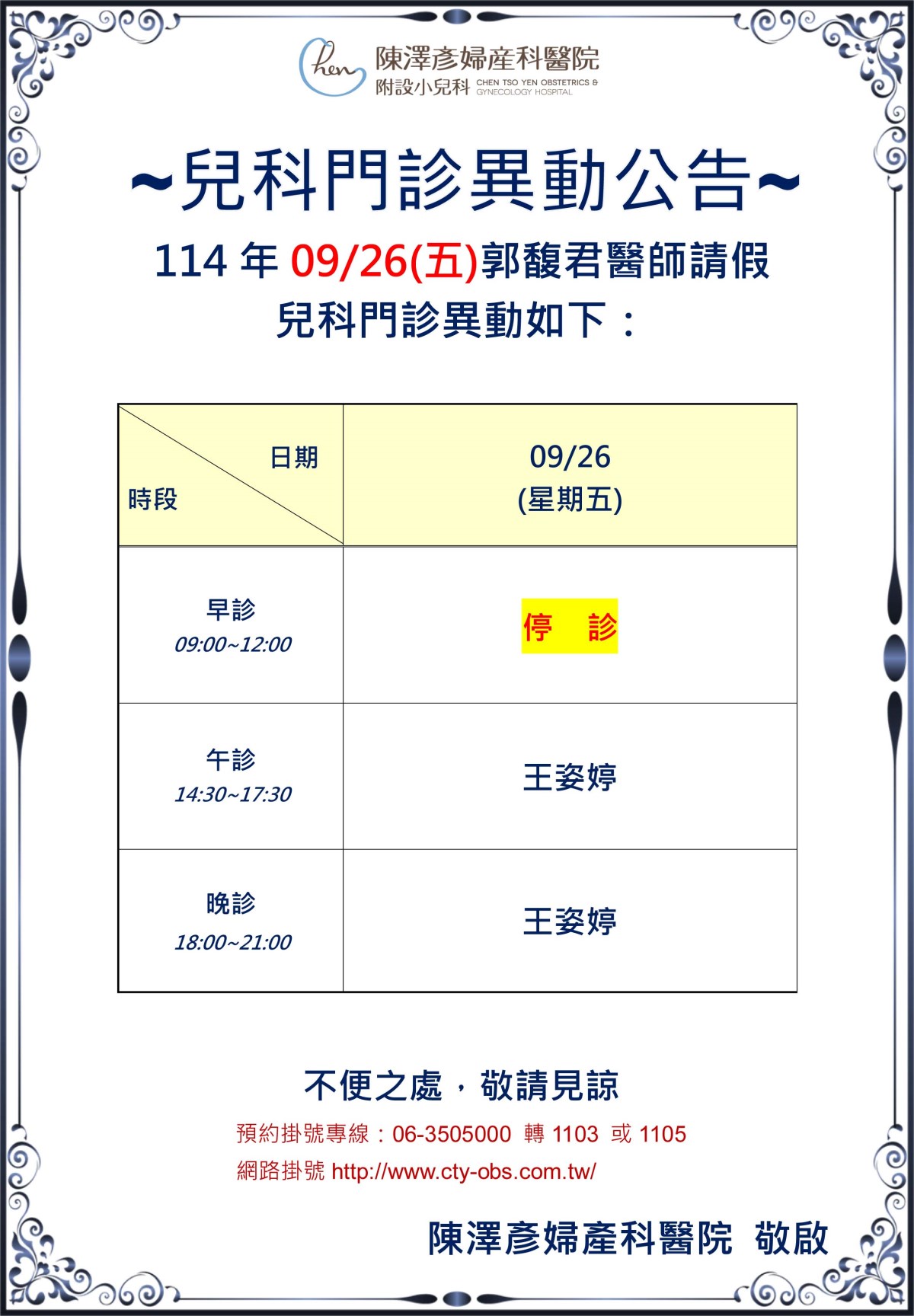 114年09月26日 兒科門診異動公告