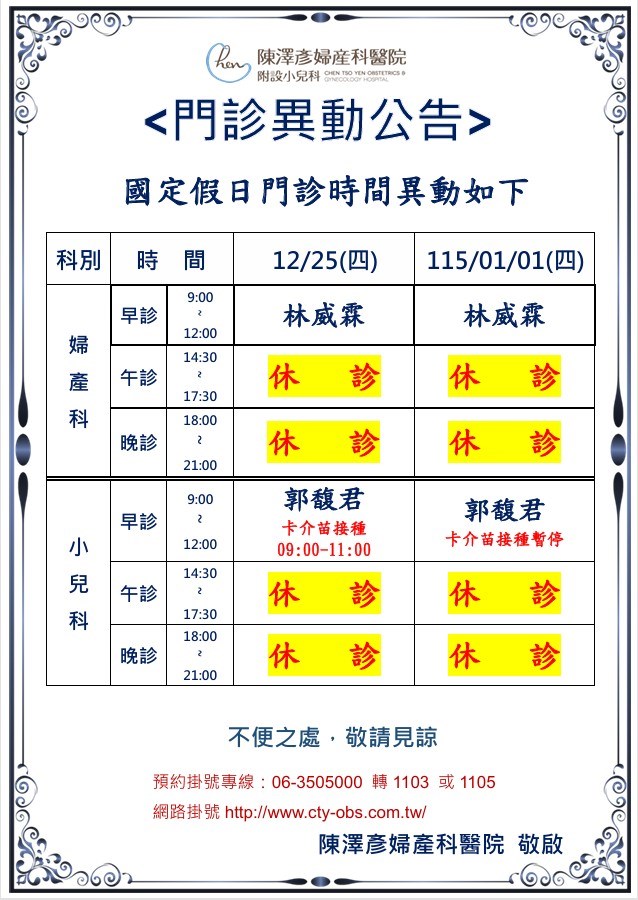114年12月25日、115年01月01日 國定假日門診時間異動公告